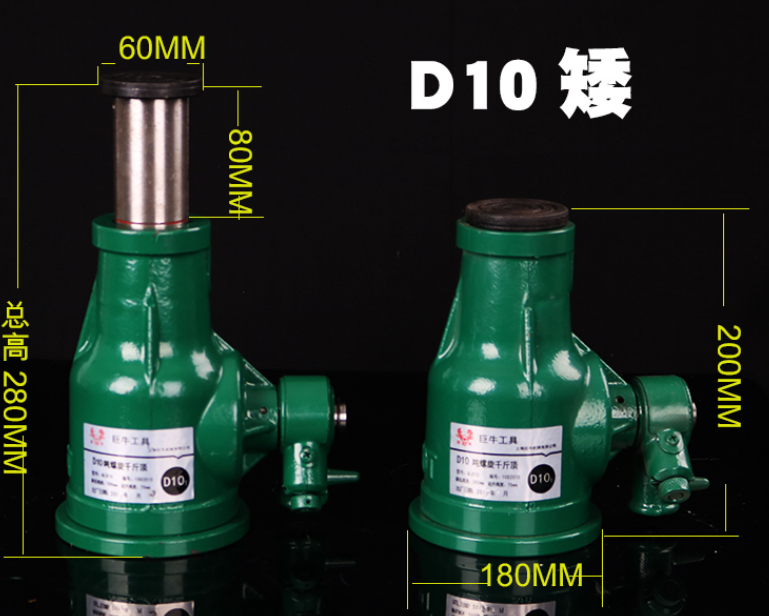 2、不同噸位的螺旋千斤頂高矮胖瘦也不同。比如說10噸高瘦螺旋千斤頂和20噸高瘦螺旋千斤頂的區分,也區分在了頂升高度,底座寬度,與頂蓋的寬度上,見圖可知道。